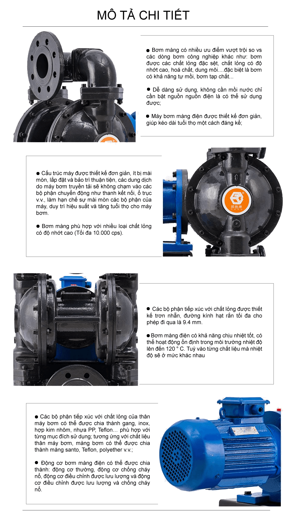 Bơm màng điện gang công suất 245 lít/phút sử dụng động cơ điện làm nguồn năng lượng, dẫn động thông qua bộ phận giảm tốc và trục khuỷu, bơm được chất lỏng đặc sệt, độ nhớt cao, hóa chất, dung môi.