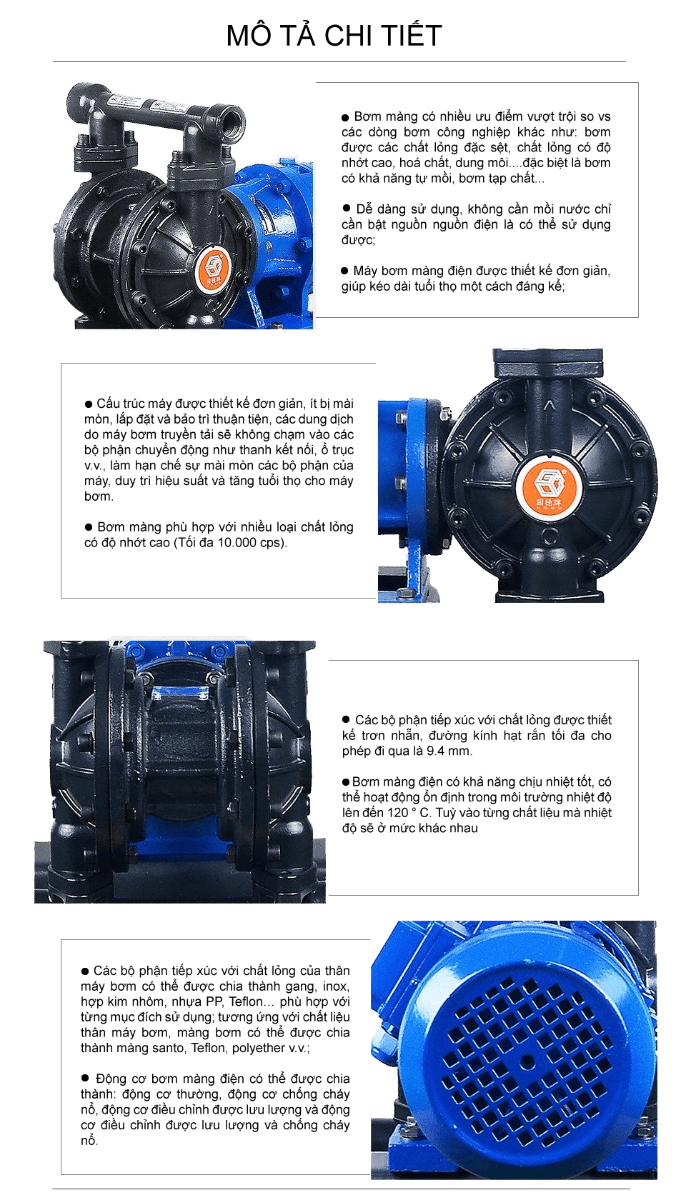Bơm màng điện gang công suất 12,8 lít/phút sử dụng động cơ điện làm nguồn năng lượng, dẫn động thông qua bộ phận giảm tốc và trục khuỷu, bơm được chất lỏng đặc sệt, độ nhớt cao, hóa chất, dung môi.