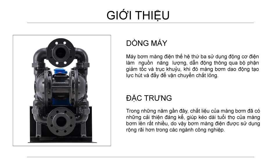 Bơm màng điện gang công suất 245 lít/phút sử dụng động cơ điện làm nguồn năng lượng, dẫn động thông qua bộ phận giảm tốc và trục khuỷu, bơm được chất lỏng đặc sệt, độ nhớt cao, hóa chất, dung môi.