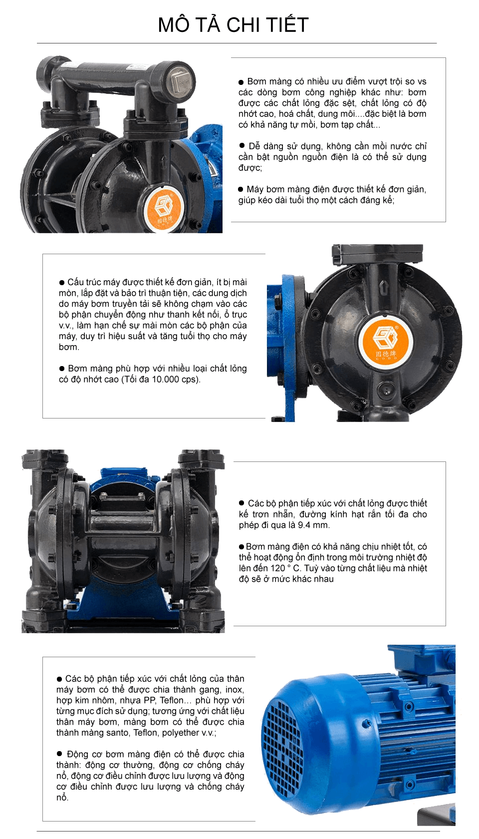 Bơm màng điện gang công suất 48 lít/phút sử dụng động cơ điện làm nguồn năng lượng, dẫn động thông qua bộ phận giảm tốc và trục khuỷu, bơm được chất lỏng đặc sệt, độ nhớt cao, hóa chất, dung môi.