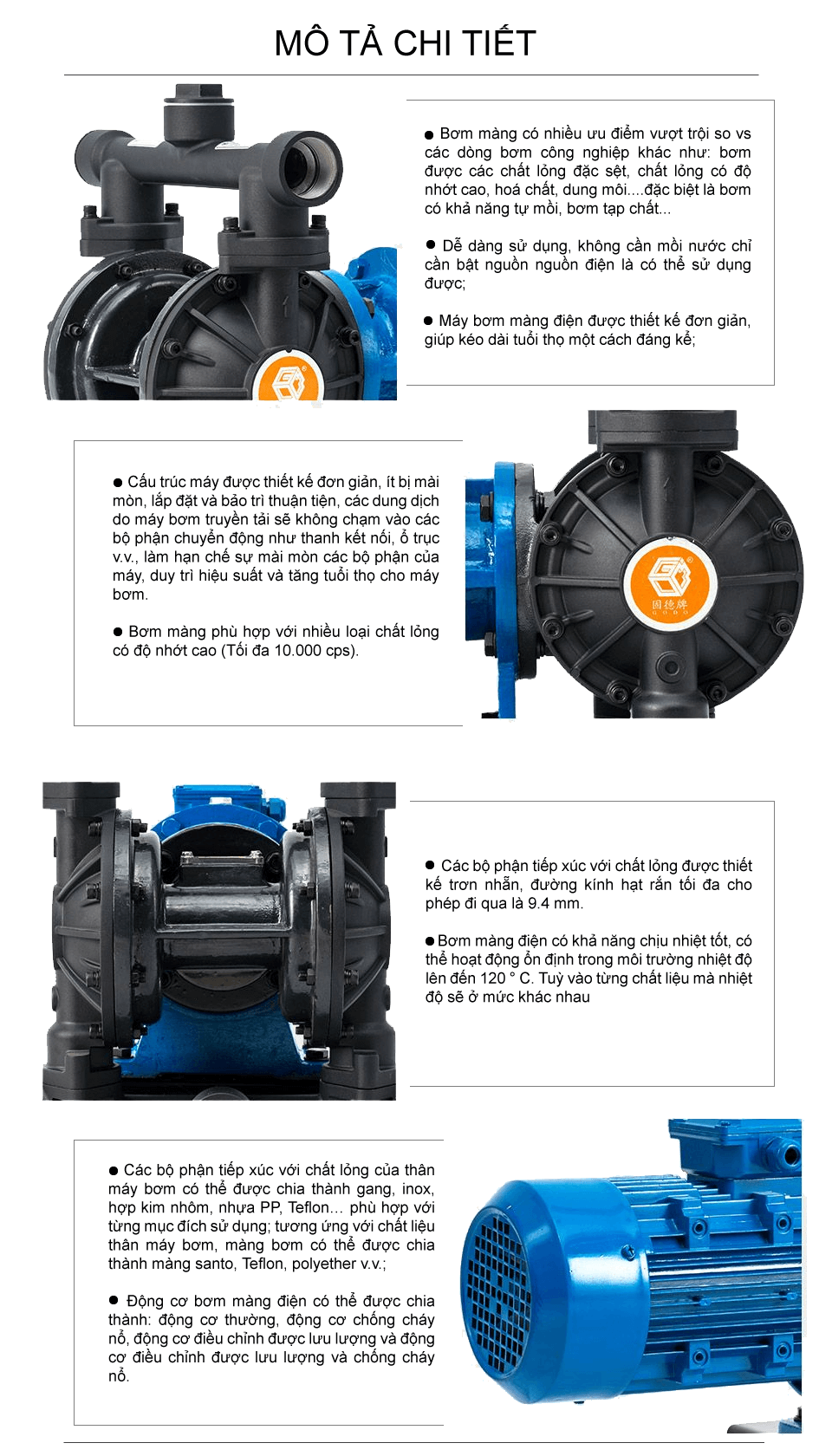 Bơm màng điện gang công suất 48 lít/phút sử dụng động cơ điện làm nguồn năng lượng, dẫn động thông qua bộ phận giảm tốc và trục khuỷu, bơm được chất lỏng đặc sệt, độ nhớt cao, hóa chất, dung môi.