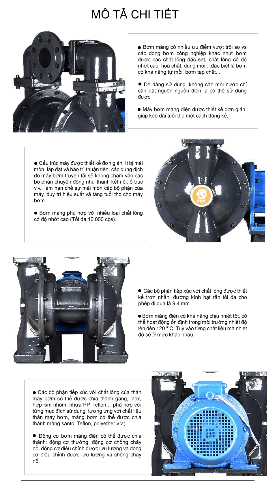 Bơm màng điện gang công suất 480 lít/phút sử dụng động cơ điện làm nguồn năng lượng, dẫn động thông qua bộ phận giảm tốc và trục khuỷu, bơm được chất lỏng đặc sệt, độ nhớt cao, hóa chất, dung môi.