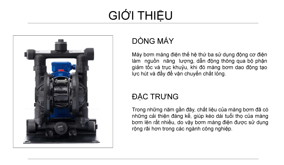 Bơm màng điện nhựa hợp kim nhôm công suất 12,8 lít/phút sử dụng động cơ điện làm nguồn năng lượng, dẫn động thông qua bộ phận giảm tốc và trục khuỷu, bơm được chất lỏng đặc sệt, độ nhớt cao, hóa chất, dung môi.