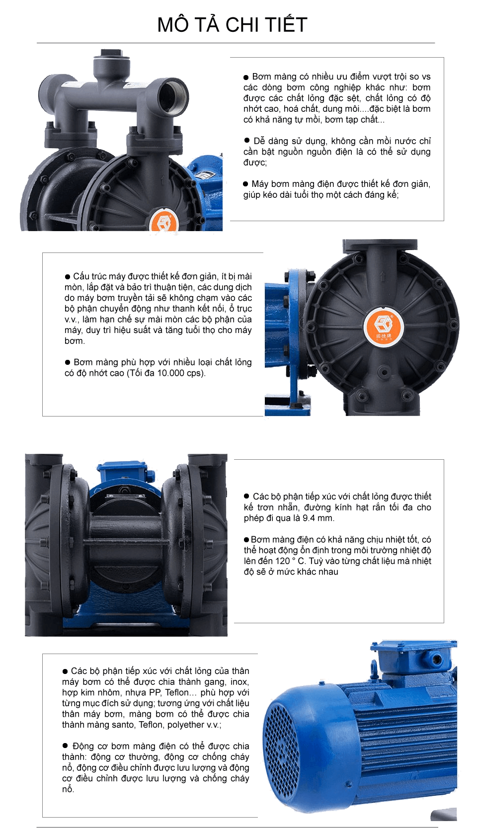 Bơm màng điện hợp kim nhôm công suất 162 lít/phút sử dụng động cơ điện làm nguồn năng lượng, dẫn động thông qua bộ phận giảm tốc và trục khuỷu, bơm được chất lỏng đặc sệt, độ nhớt cao, hóa chất, dung môi.