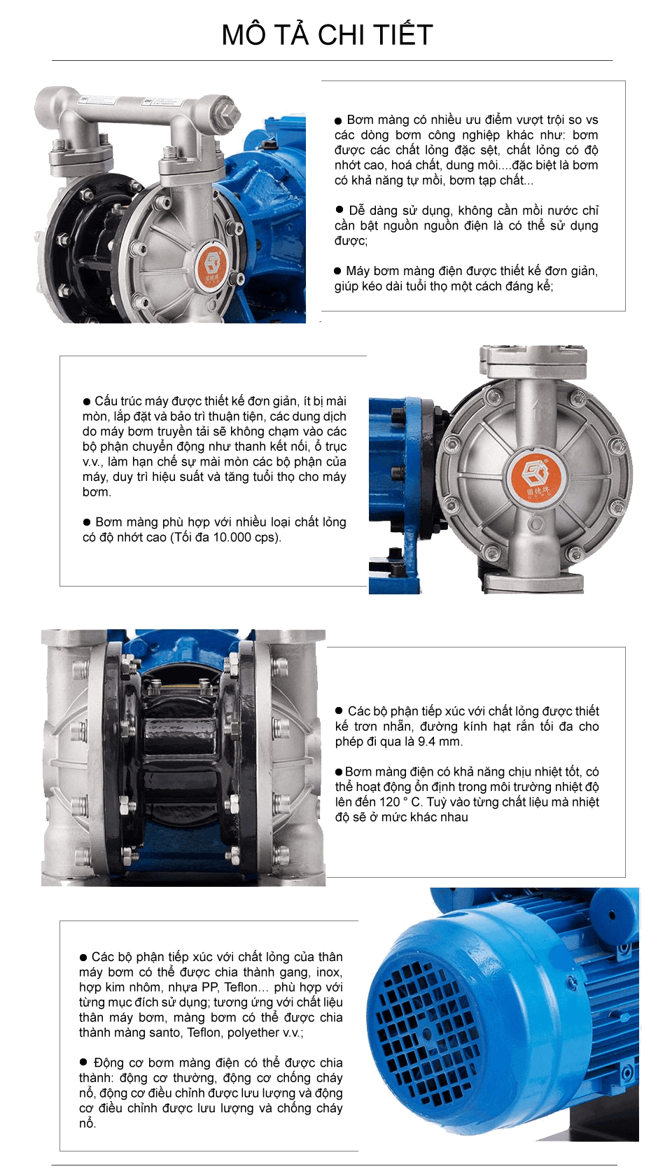 Bơm màng điện inox công suất 12,8 lít/phút sử dụng động cơ điện làm nguồn năng lượng, dẫn động thông qua bộ phận giảm tốc và trục khuỷu, bơm được chất lỏng đặc sệt, độ nhớt cao, hóa chất, dung môi.