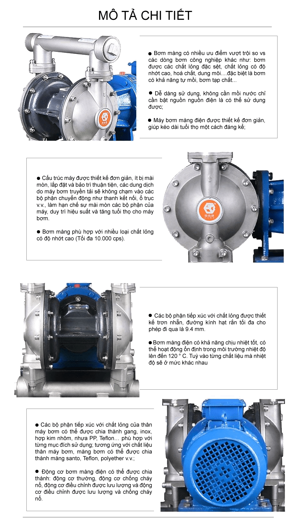 Bơm màng điện inox công suất 162 lít/phút sử dụng động cơ điện làm nguồn năng lượng, dẫn động thông qua bộ phận giảm tốc và trục khuỷu, bơm được chất lỏng đặc sệt, độ nhớt cao, hóa chất, dung môi.