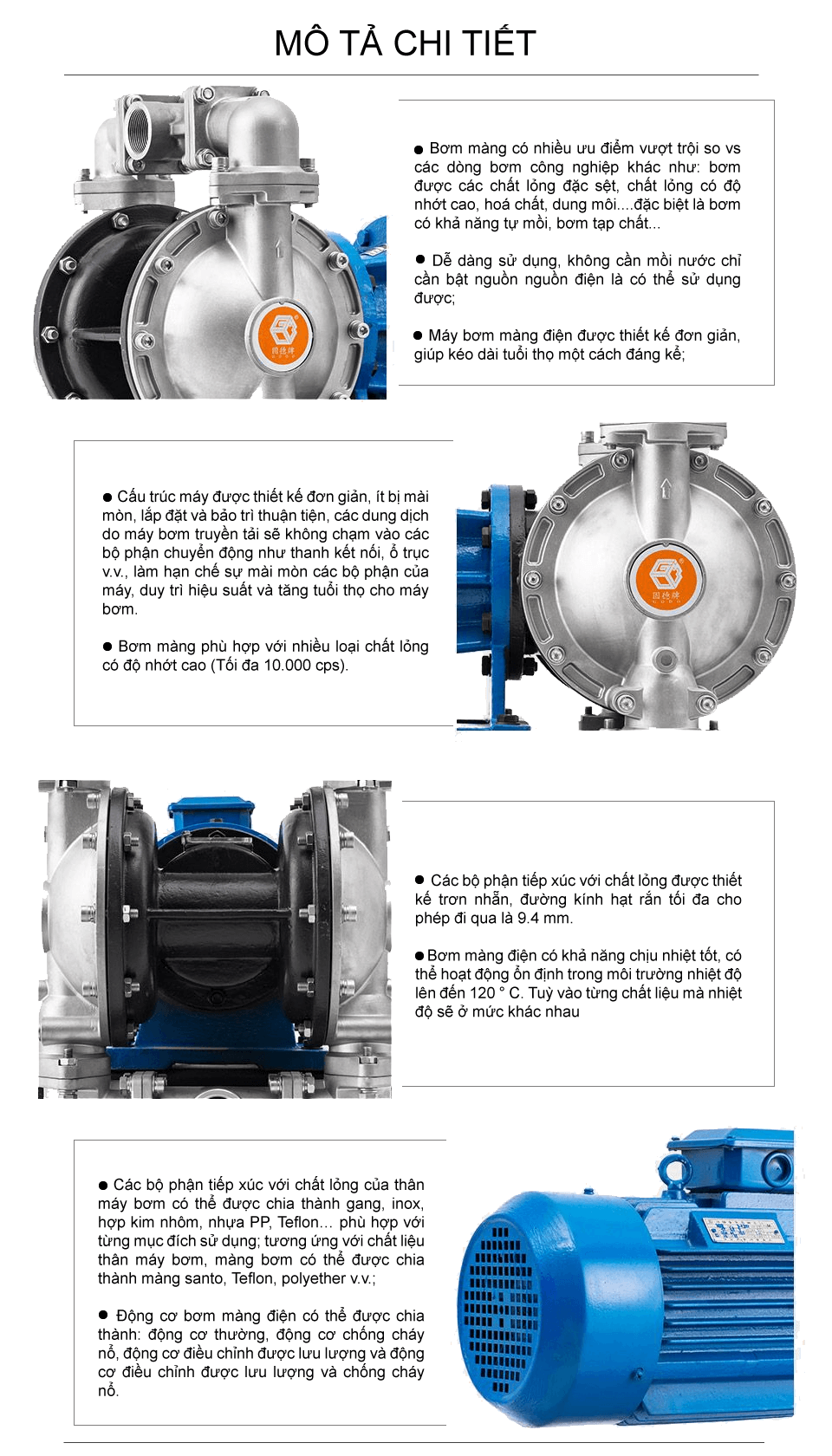 Bơm màng điện inox công suất 162 lít/phút sử dụng động cơ điện làm nguồn năng lượng, dẫn động thông qua bộ phận giảm tốc và trục khuỷu, bơm được chất lỏng đặc sệt, độ nhớt cao, hóa chất, dung môi.