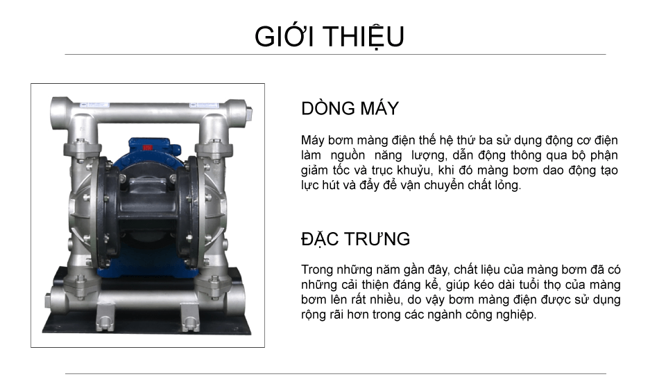 Bơm màng điện inox công suất 48 lít/phút sử dụng động cơ điện làm nguồn năng lượng, dẫn động thông qua bộ phận giảm tốc và trục khuỷu, bơm được chất lỏng đặc sệt, độ nhớt cao, hóa chất, dung môi.