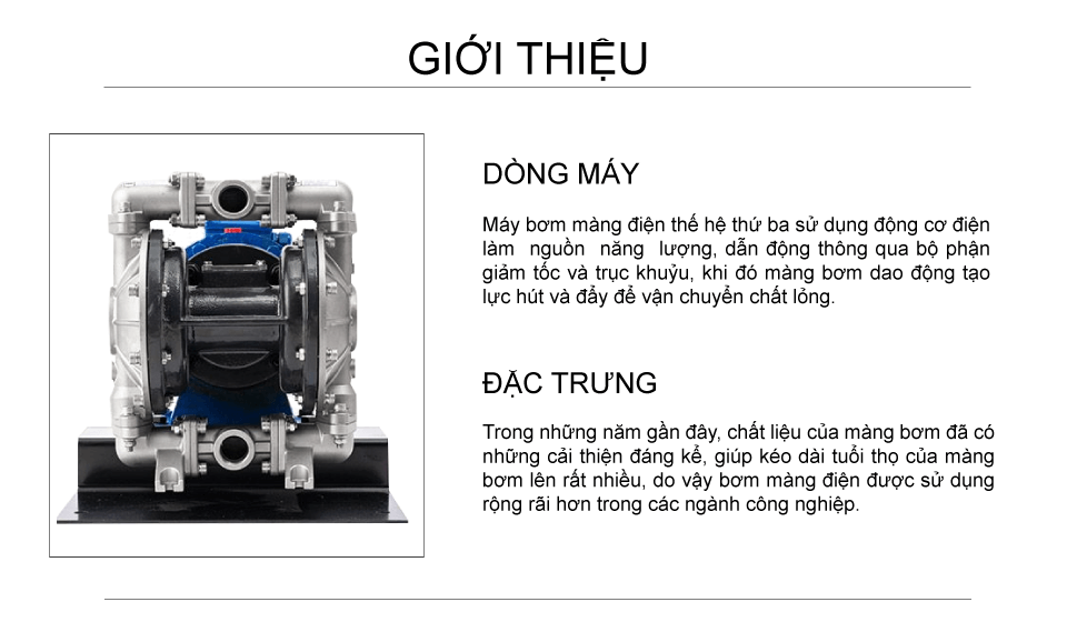 Bơm màng điện inox công suất 48 lít/phút sử dụng động cơ điện làm nguồn năng lượng, dẫn động thông qua bộ phận giảm tốc và trục khuỷu, bơm được chất lỏng đặc sệt, độ nhớt cao, hóa chất, dung môi.
