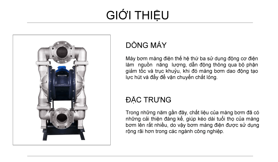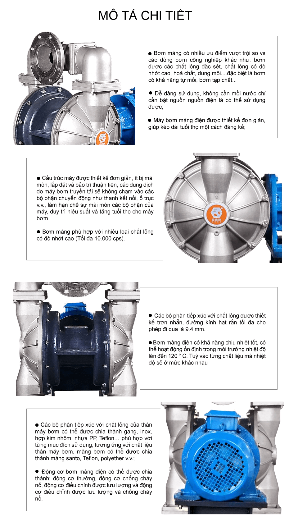 Bơm màng điện inox công suất 480 lít/phút sử dụng động cơ điện làm nguồn năng lượng, dẫn động thông qua bộ phận giảm tốc và trục khuỷu, bơm được chất lỏng đặc sệt, độ nhớt cao, hóa chất, dung môi.
