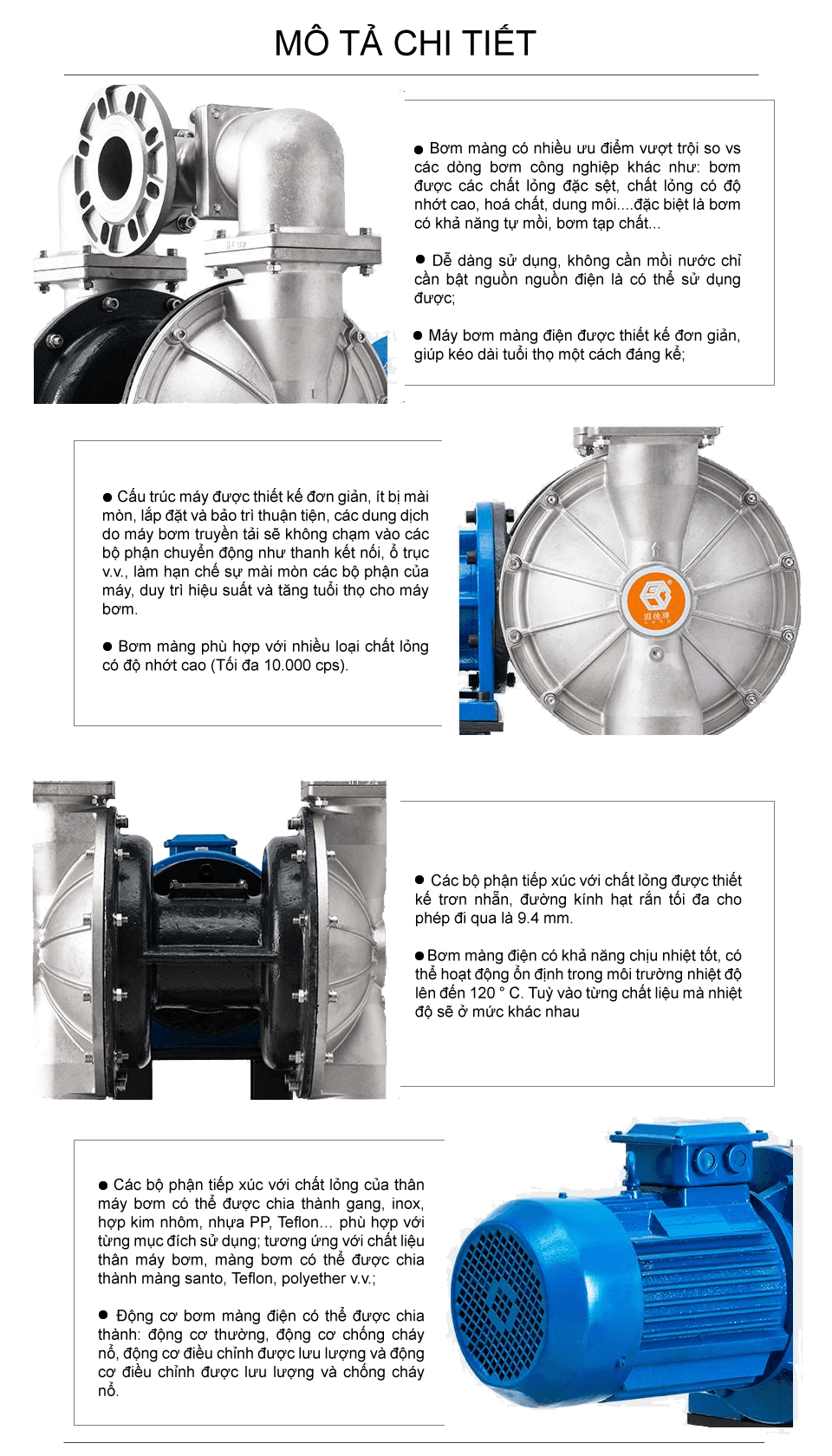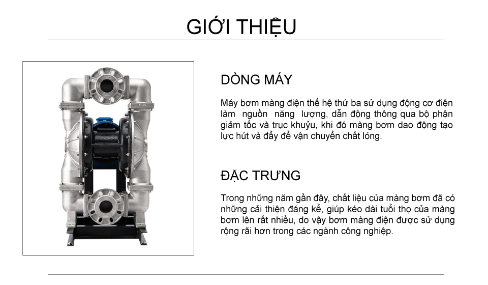 Bơm màng điện inox công suất 480 lít/phút sử dụng động cơ điện làm nguồn năng lượng, dẫn động thông qua bộ phận giảm tốc và trục khuỷu, bơm được chất lỏng đặc sệt, độ nhớt cao, hóa chất, dung môi.