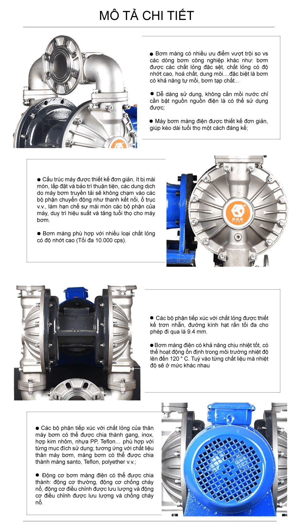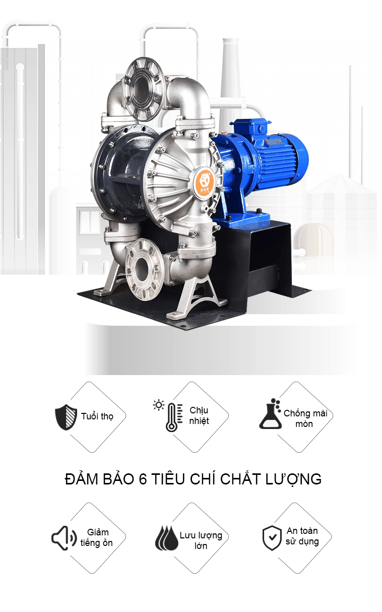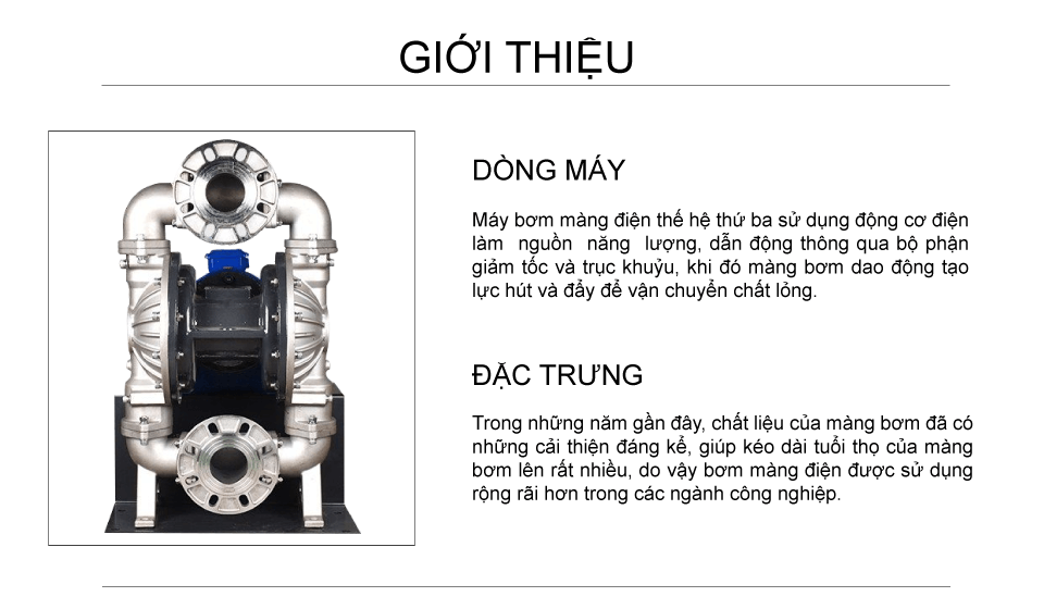 Bơm màng điện inox công suất 245 lít/phút sử dụng động cơ điện làm nguồn năng lượng, dẫn động thông qua bộ phận giảm tốc và trục khuỷu, bơm được chất lỏng đặc sệt, độ nhớt cao, hóa chất, dung môi.