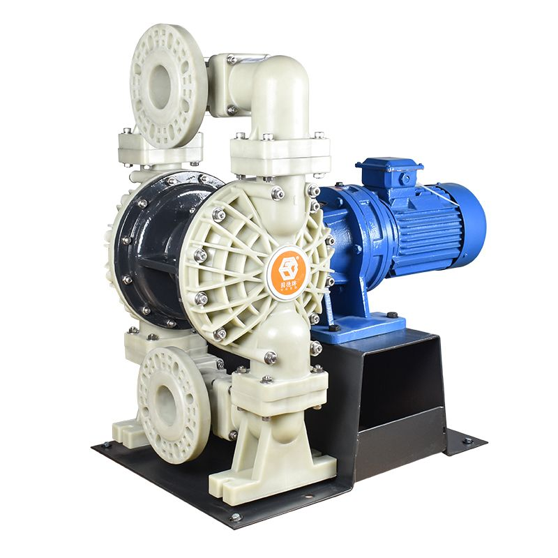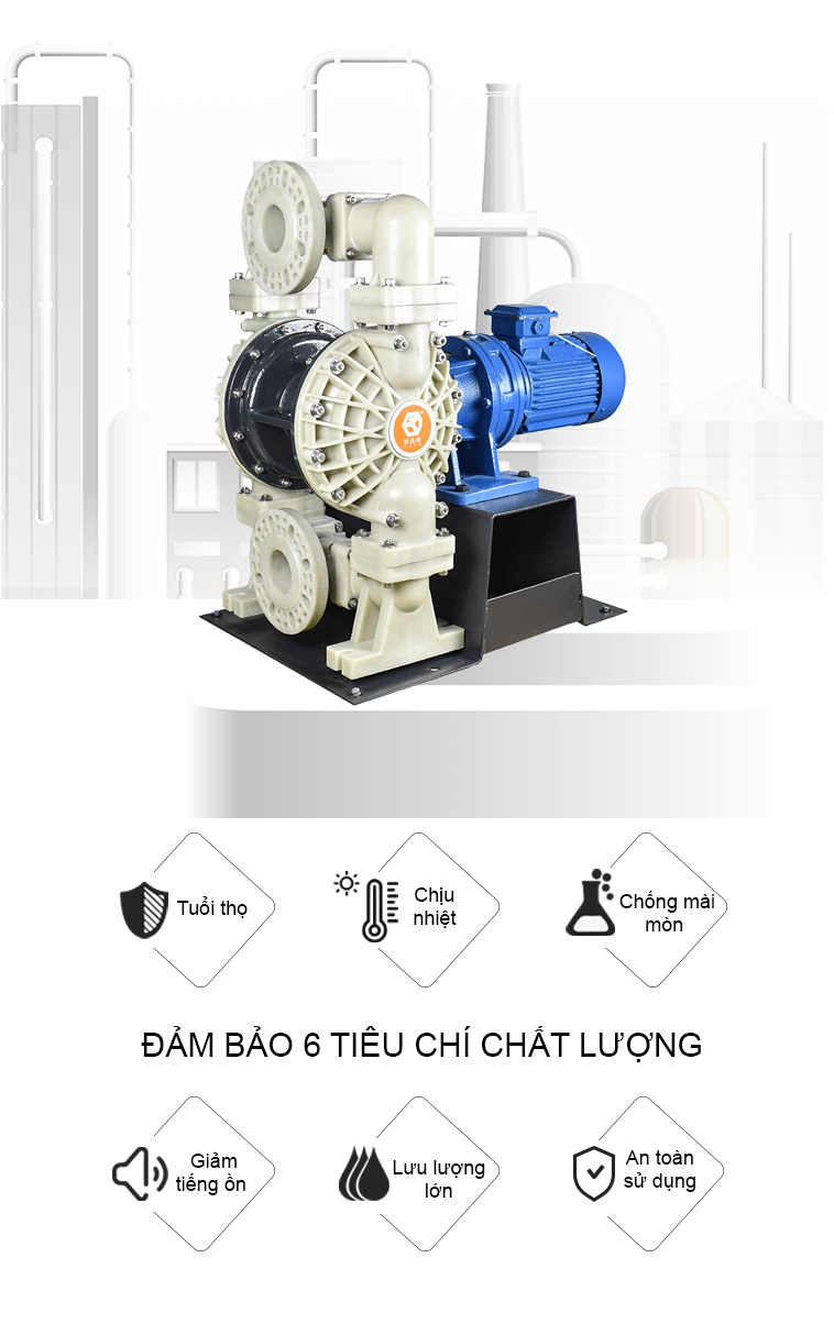 Bơm màng điện nhựa PP công suất 245 lít/phút sử dụng động cơ điện làm nguồn năng lượng, dẫn động thông qua bộ phận giảm tốc và trục khuỷu, bơm được chất lỏng đặc sệt, độ nhớt cao, hóa chất, dung môi.