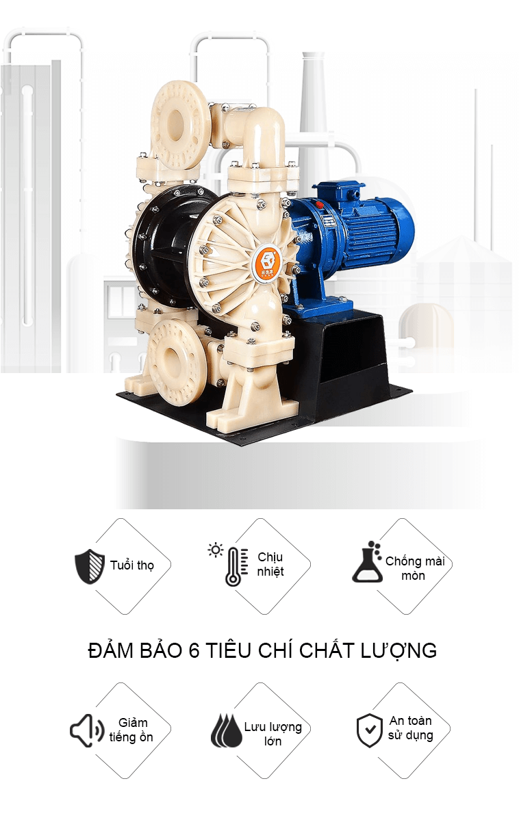 Bơm màng điện teflon công suất 245 lít/phút sử dụng động cơ điện làm nguồn năng lượng, dẫn động thông qua bộ phận giảm tốc và trục khuỷu, bơm được chất lỏng đặc sệt, độ nhớt cao, hóa chất, dung môi.