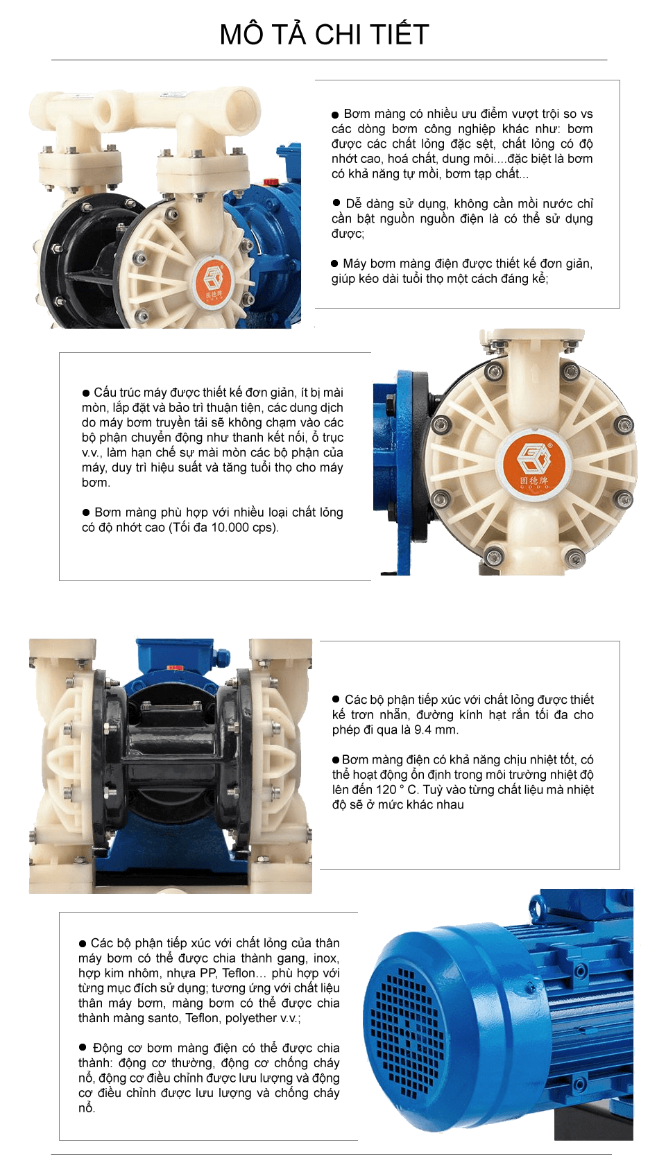 Bơm màng điện teflon công suất 48 lít/phút sử dụng động cơ điện làm nguồn năng lượng, dẫn động thông qua bộ phận giảm tốc và trục khuỷu, bơm được chất lỏng đặc sệt, độ nhớt cao, hóa chất, dung môi.