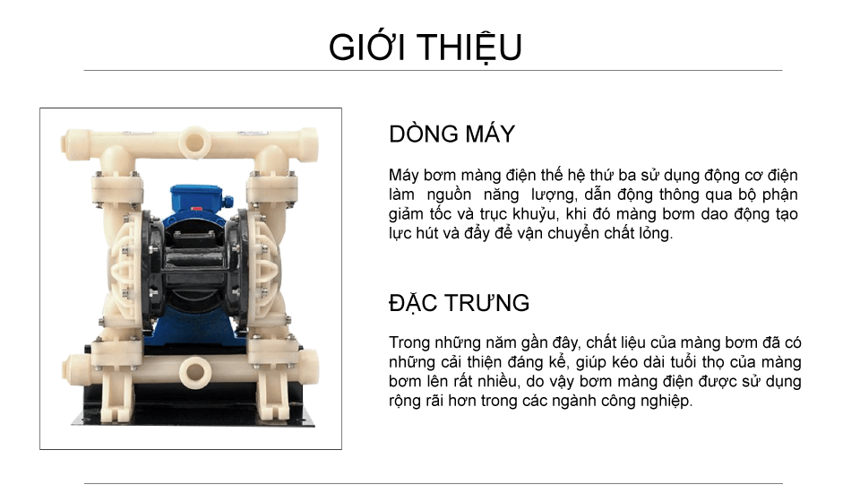 Bơm màng điện teflon công suất 48 lít/phút sử dụng động cơ điện làm nguồn năng lượng, dẫn động thông qua bộ phận giảm tốc và trục khuỷu, bơm được chất lỏng đặc sệt, độ nhớt cao, hóa chất, dung môi.