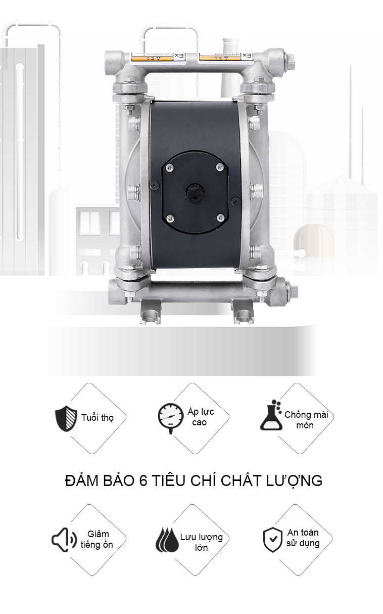 An toàn phòng nổ – không sử dụng điện: máy bơm màng QBY4-15-I hoạt động hoàn toàn bằng khí nén, không phát sinh tia lửa điện, thích hợp sử dụng trong các khu vực có khí dễ cháy, hơi dung môi hoặc trong phòng sạch yêu cầu chống tĩnh điện.