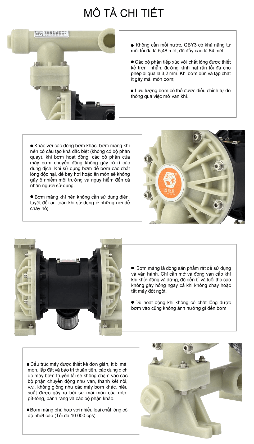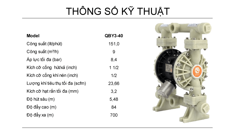 Máy bơm màng khí nén nhựa PP công suất 151 lít/phút là dòng máy sử dụng khí nén làm nguồn năng, bơm được chất lỏng đặc sệt, chất lỏng có độ nhớt cao, hóa chất, dung môi,... đặc biệt là có khả năng chạy khô, tự mồi và không gây cháy nổ.