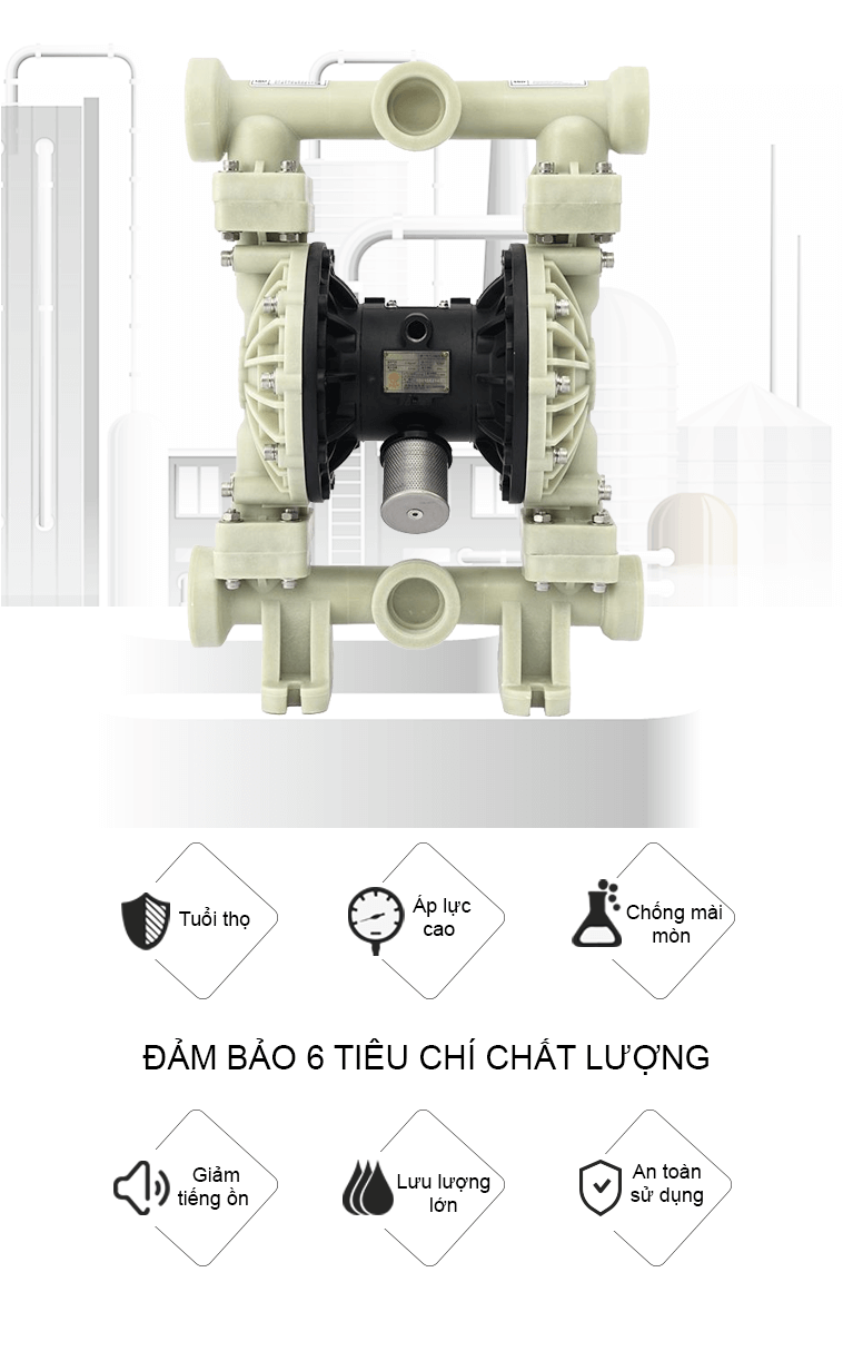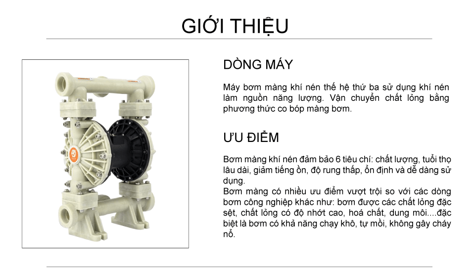Máy bơm màng khí nén nhựa pp công suất 378,5 lít/phút là dòng máy sử dụng khí nén làm nguồn năng, bơm được chất lỏng đặc sệt, chất lỏng có độ nhớt cao, hóa chất, dung môi,... đặc biệt là có khả năng chạy khô, tự mồi và không gây cháy nổ.
