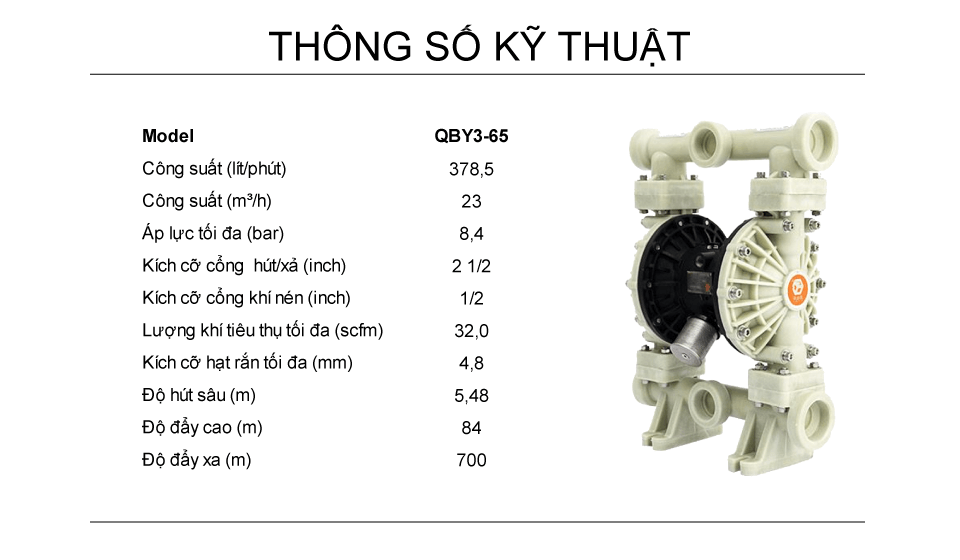 Bơm Màng Khí Nén 2 - 1/2 - Nhựa PP Công Suất - 378,5 LPM QBY3-65-PP