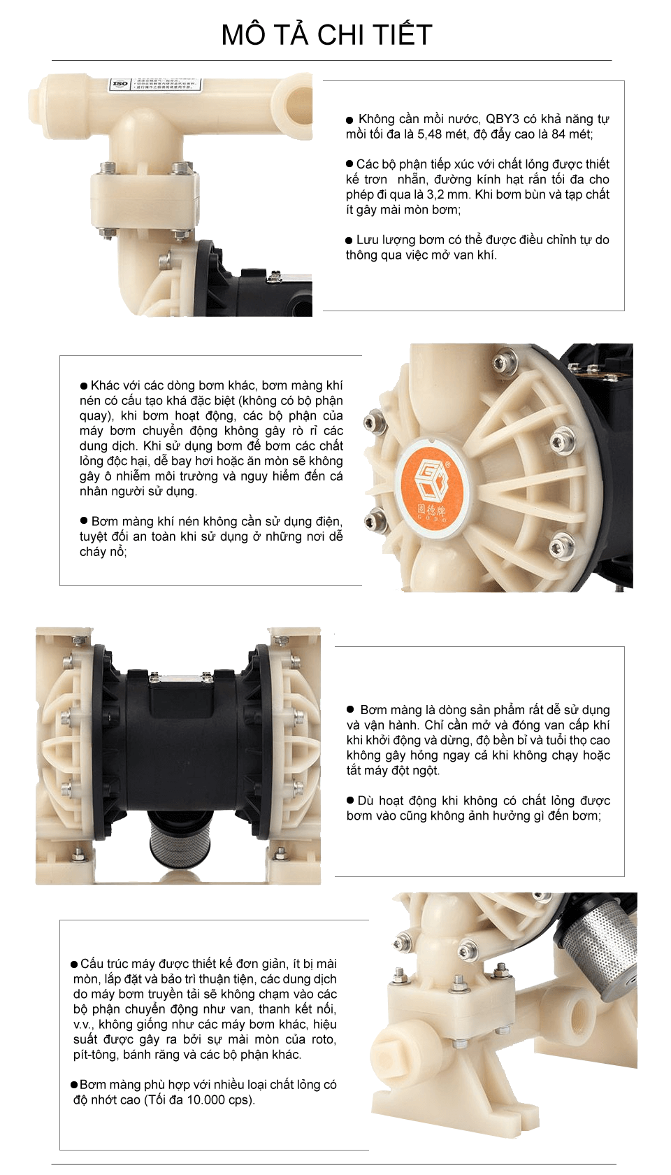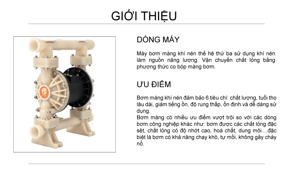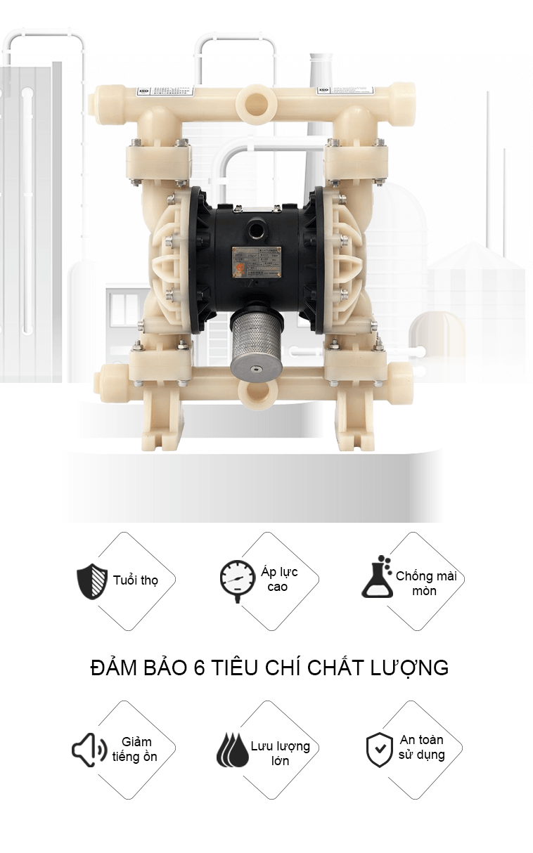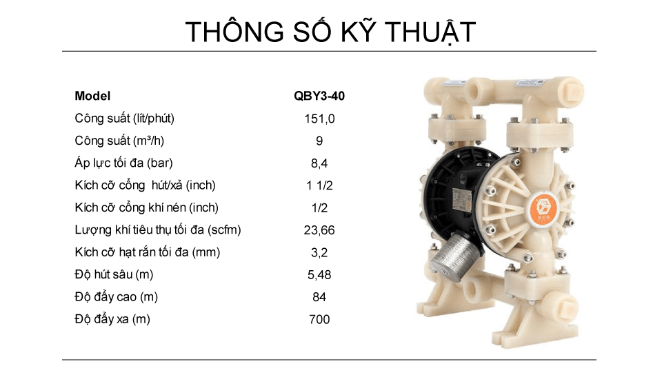 Máy bơm màng khí nén teflon công suất 151 lít/phút là dòng máy sử dụng khí nén làm nguồn năng, bơm được chất lỏng đặc sệt, chất lỏng có độ nhớt cao, hóa chất, dung môi,... đặc biệt là có khả năng chạy khô, tự mồi và không gây cháy nổ.