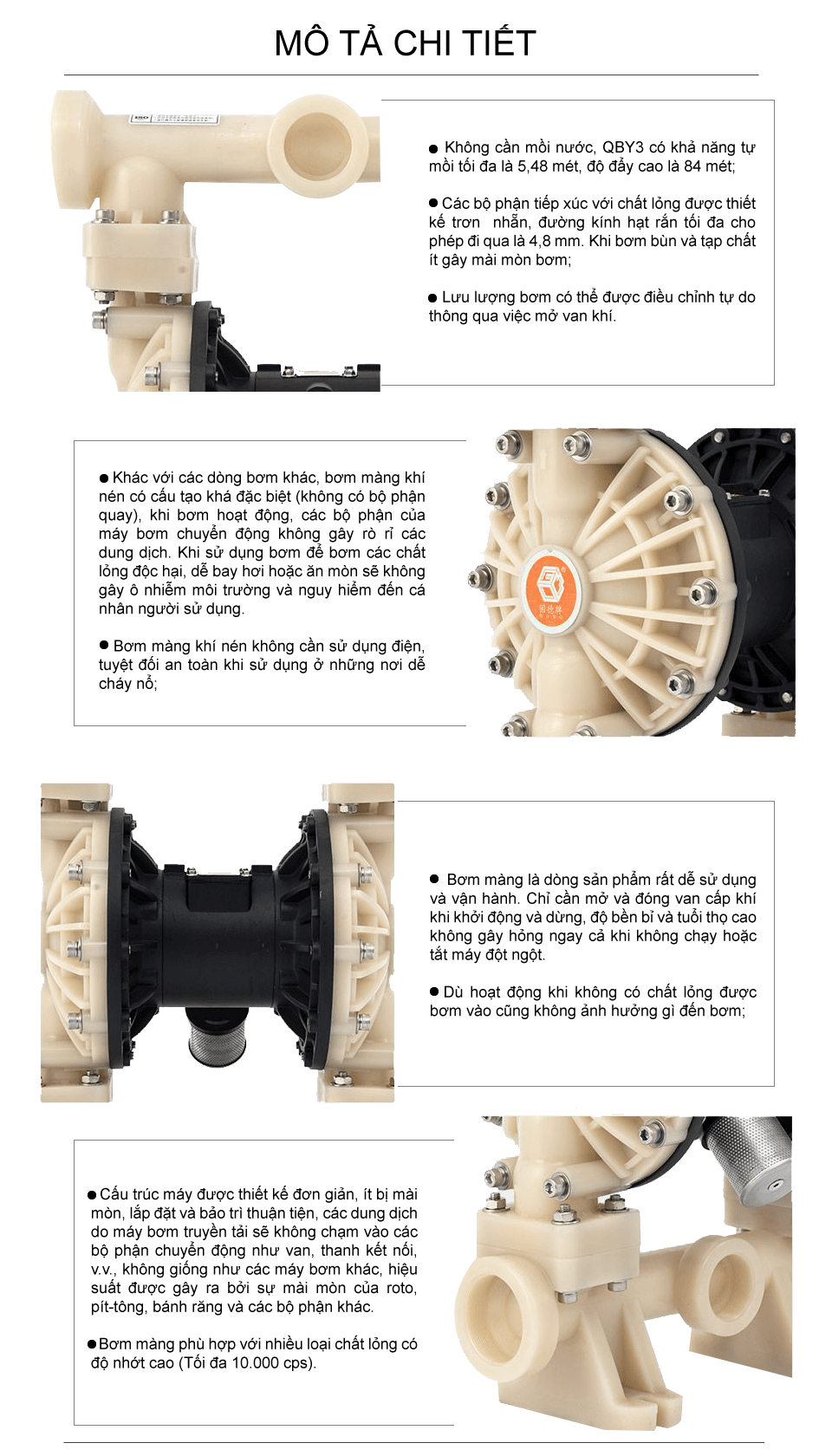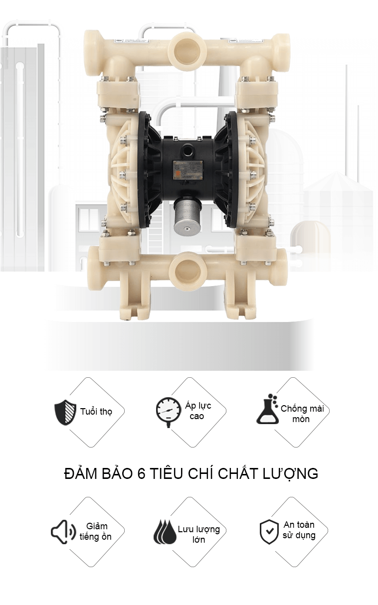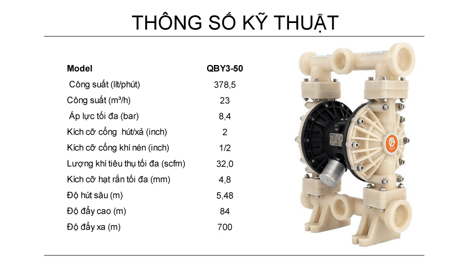 Máy bơm màng khí nén teflon công suất 378,5 lít/phút là dòng máy sử dụng khí nén làm nguồn năng, bơm được chất lỏng đặc sệt, chất lỏng có độ nhớt cao, hóa chất, dung môi,... đặc biệt là có khả năng chạy khô, tự mồi và không gây cháy nổ.