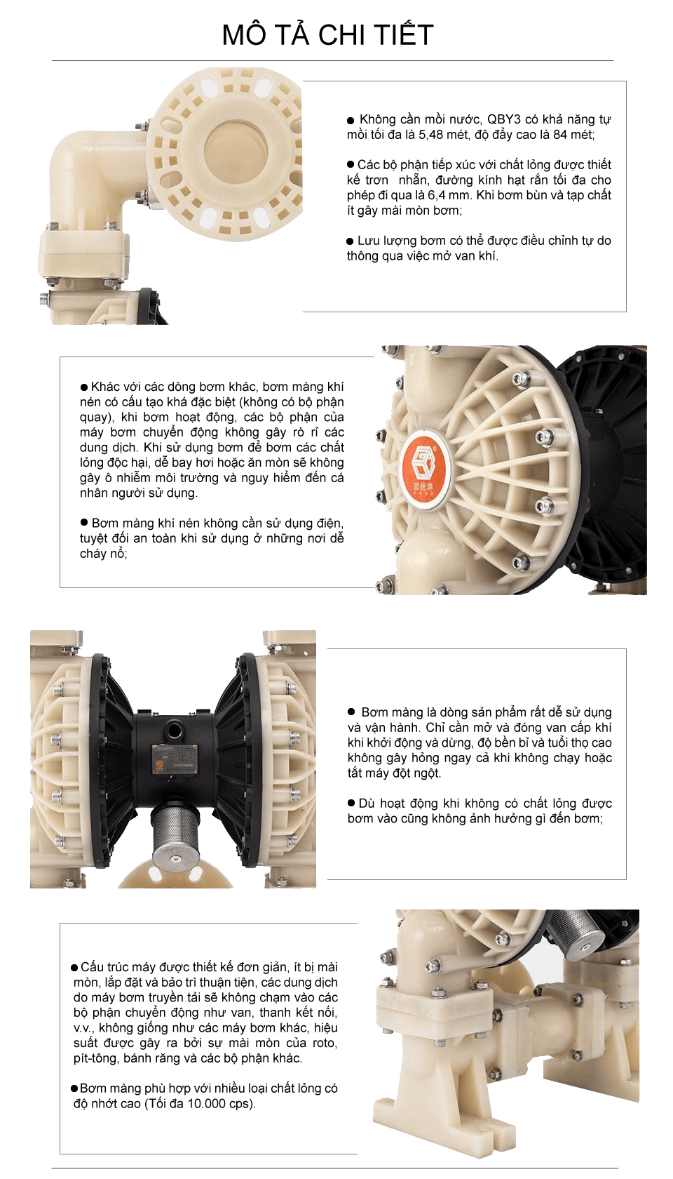 Máy bơm màng khí nén teflon công suất 568 lít/phút là dòng máy sử dụng khí nén làm nguồn năng, bơm được chất lỏng đặc sệt, chất lỏng có độ nhớt cao, hóa chất, dung môi,... đặc biệt là có khả năng chạy khô, tự mồi và không gây cháy nổ.