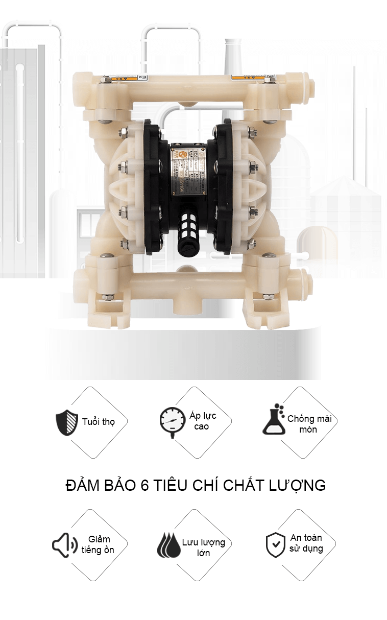 - Vận hành an toàn tuyệt đối: Do sử dụng khí nén, bơm hoàn toàn không sinh tia lửa điện, không gây nguy cơ cháy nổ – lý tưởng cho các môi trường dễ cháy như xưởng hóa chất, nhà máy sơn, sản xuất dược phẩm.