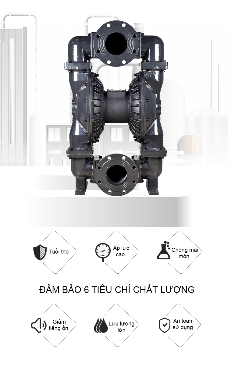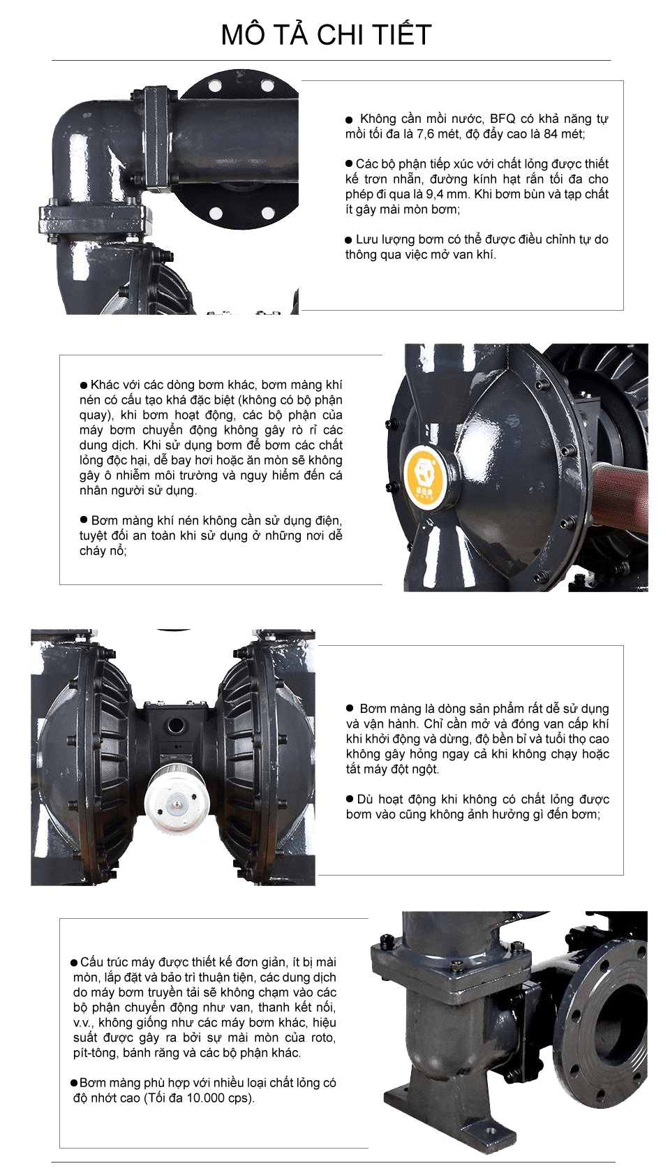 Máy bơm màng khí nén gang là dòng máy sử dụng khí nén làm nguồn năng, bơm được chất lỏng đặc sệt, chất lỏng có độ nhớt cao, hóa chất, dung môi,... đặc biệt là có khả năng chạy khô, tự mồi và không gây cháy nổ.