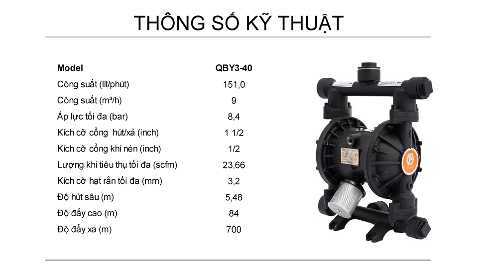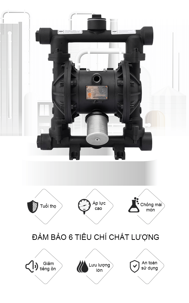 Máy bơm màng khí nén hợp kim nhôm công suất 151 lít/phút là dòng máy sử dụng khí nén làm nguồn năng, bơm được chất lỏng đặc sệt, chất lỏng có độ nhớt cao, hóa chất, dung môi,... đặc biệt là có khả năng chạy khô, tự mồi và không gây cháy nổ.