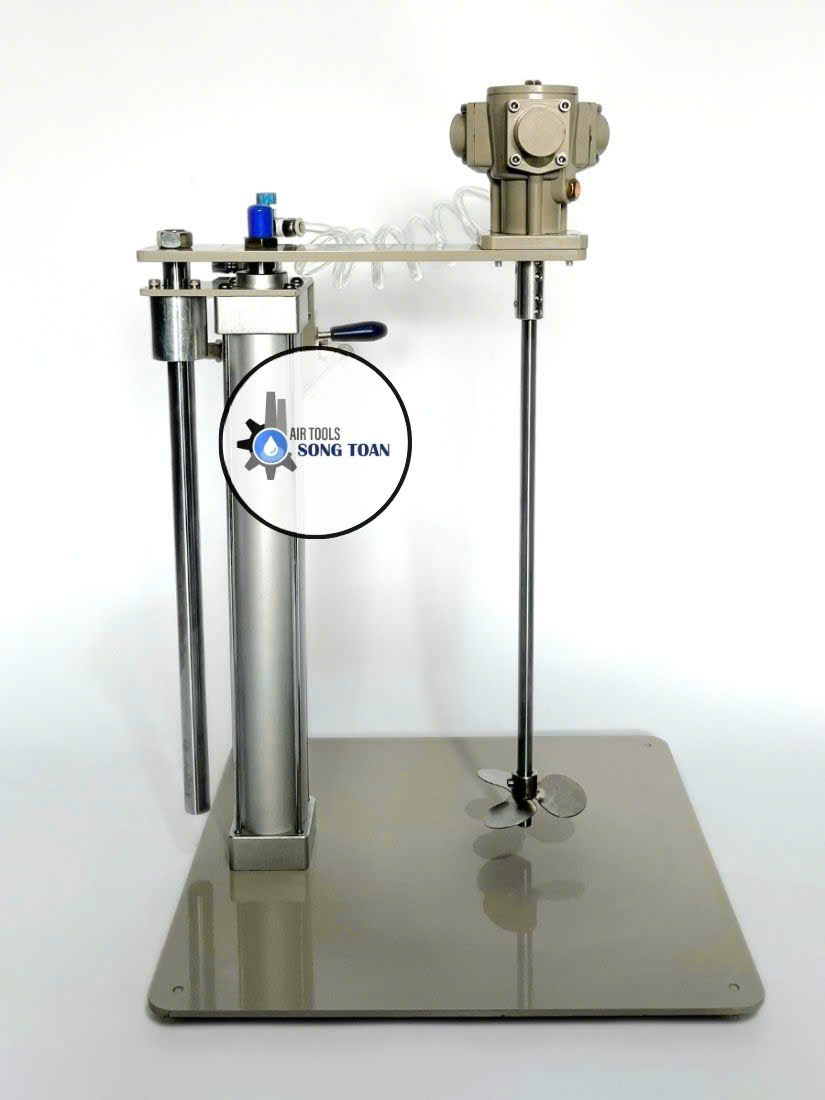 Khả năng nâng hạ tự động: Hệ thống nâng hạ bằng khí nén giúp việc khuấy trộn trở nên linh hoạt và dễ dàng hơn. Người dùng có thể điều chỉnh chiều cao khuấy phù hợp với nhiều dung tích bồn khuấy khác nhau, từ 10 đến 20 lít, giúp tối ưu hóa quy trình sản xuất.