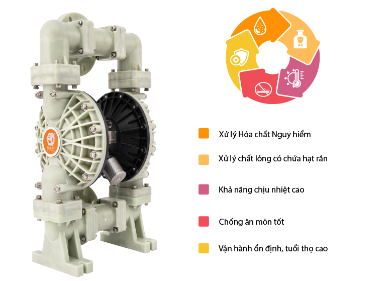 Bơm màng khí nén đảm bảo 6 tiêu chí: chất lượng, tuổi thọ lâu dài, giảm tiếng ồn, độ rung thấp, ổn định và dễ dàng sử dụng. Cấu trúc bơm được thiết kế ít bị mài mòn, rò rỉ khi bơm, bơm ít bị hỏng.